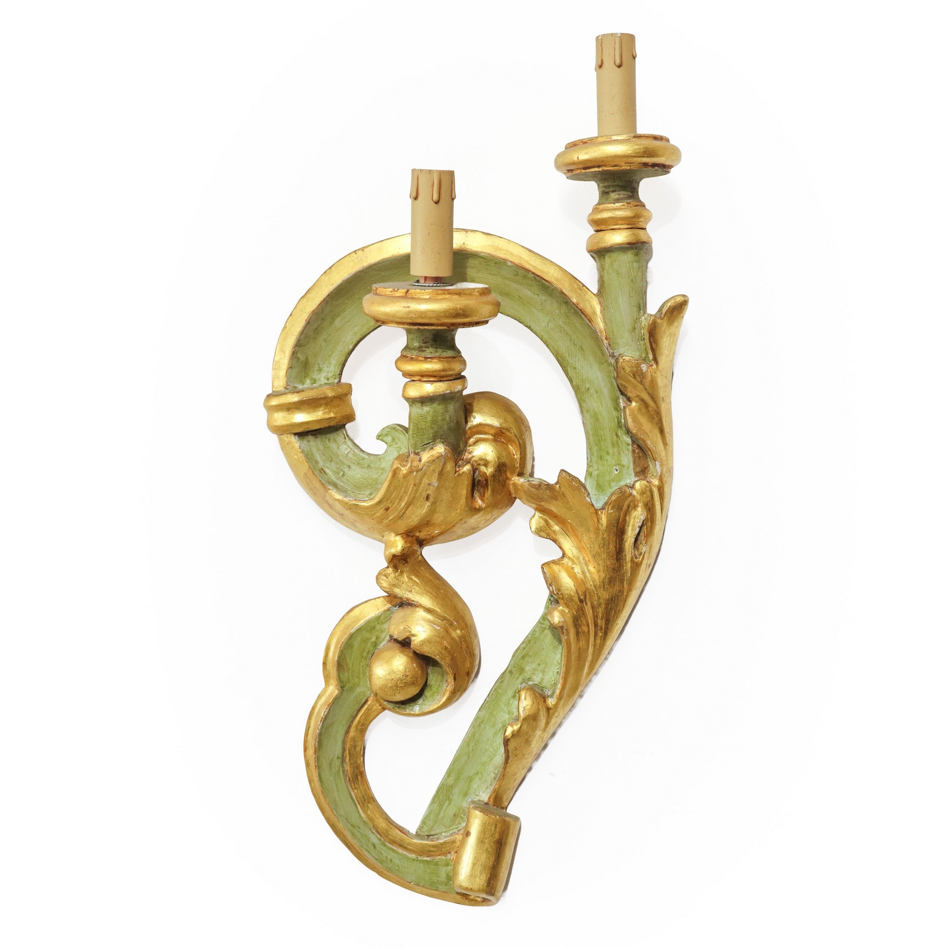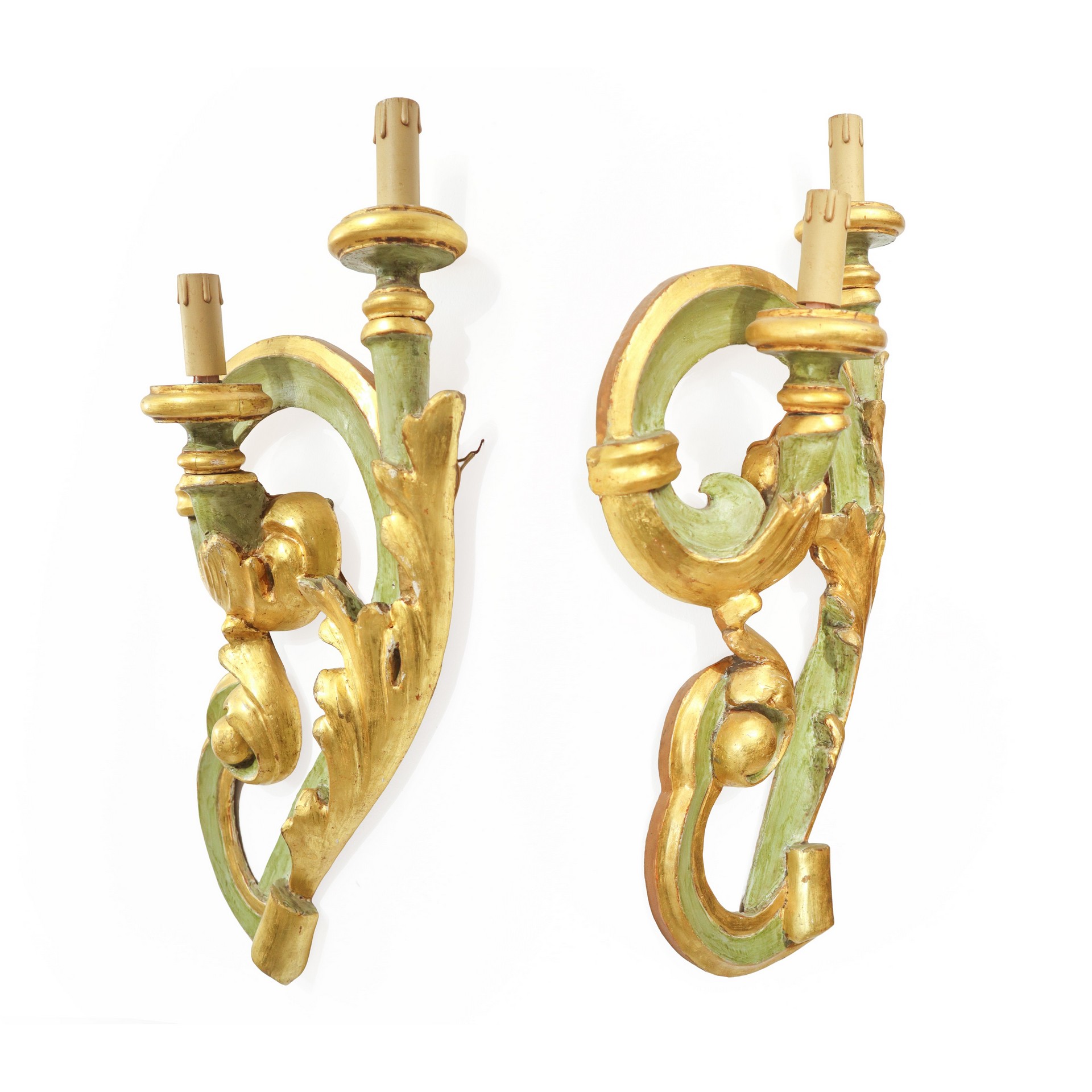Coppia di applique da muro in legno dorato e verde, due luci