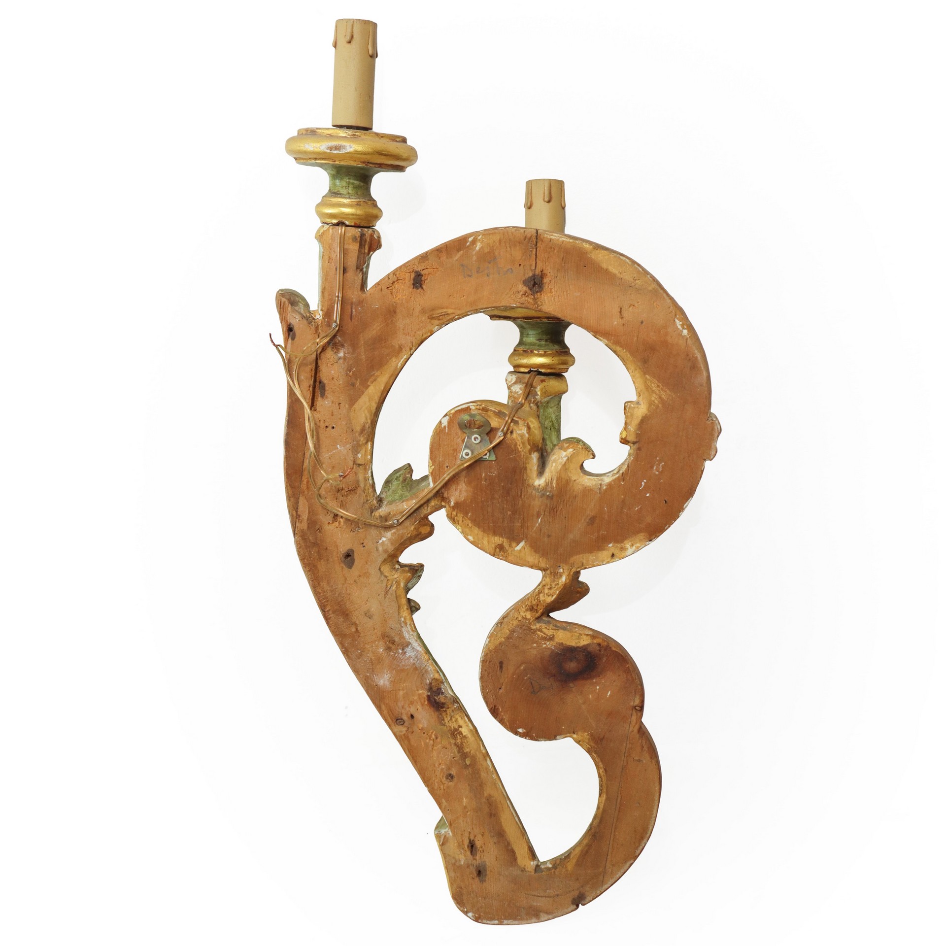 Coppia di applique da muro in legno dorato e verde, due luci h cm 58X27X12