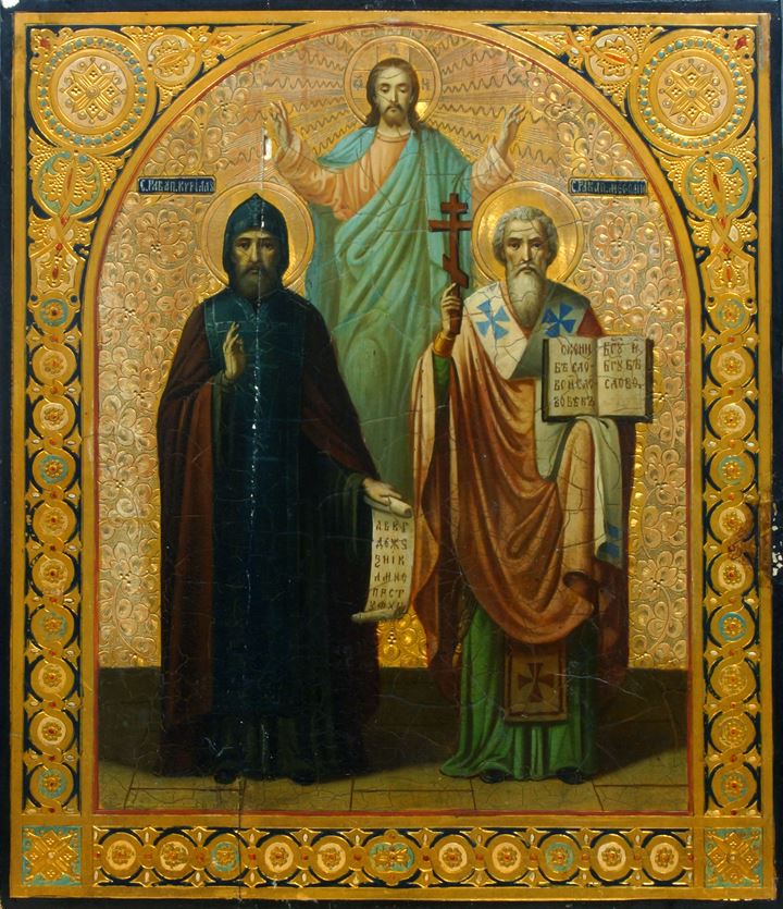 Russia, XIX secolo, raffigurante due santi e Cristo benedicente. Bordo in oro zecchino e smalti