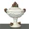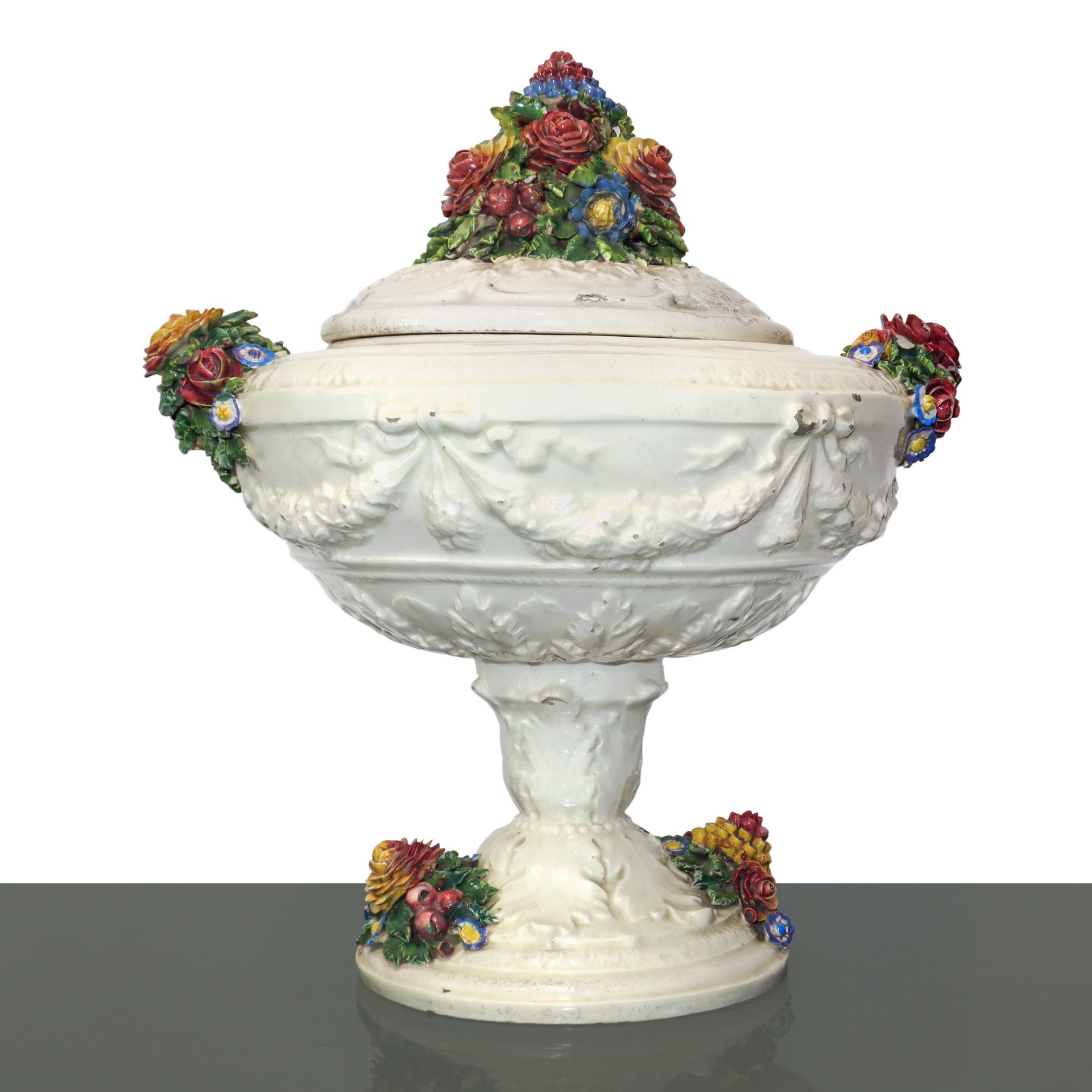 Centrotavola in ceramica di Bassano con ricco rilievo floreale sul coperchio e sui bordi, modellato a larghe foglie alla base e ricche ghirlande nella parte più ampia del fusto, 20° secolo h cm 38X base diametro cm 18 larghezza massima cm 34 Segni del tempo