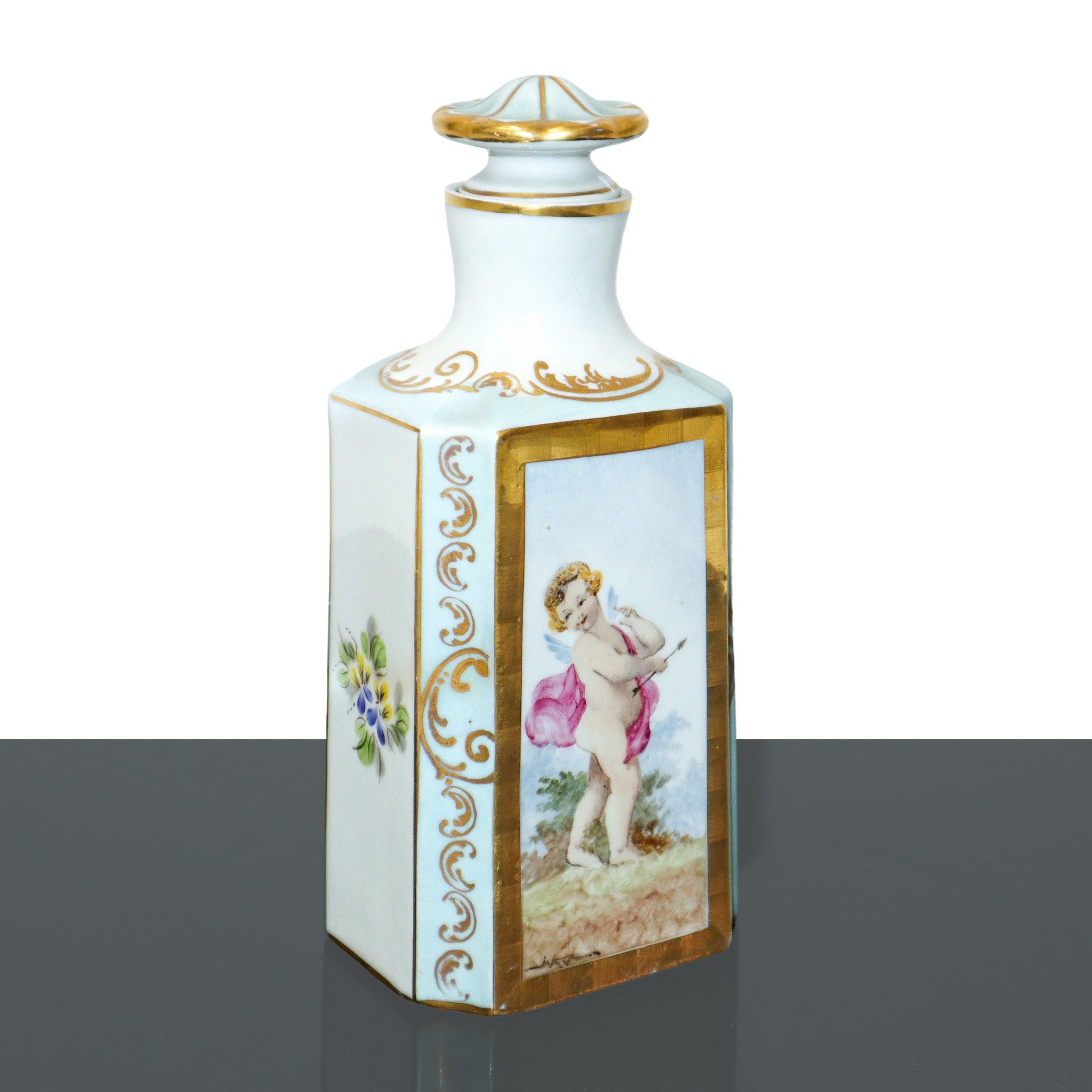 Limoges - Trittico di bottiglie e contenitore in porcellana decorata con putti dipinti