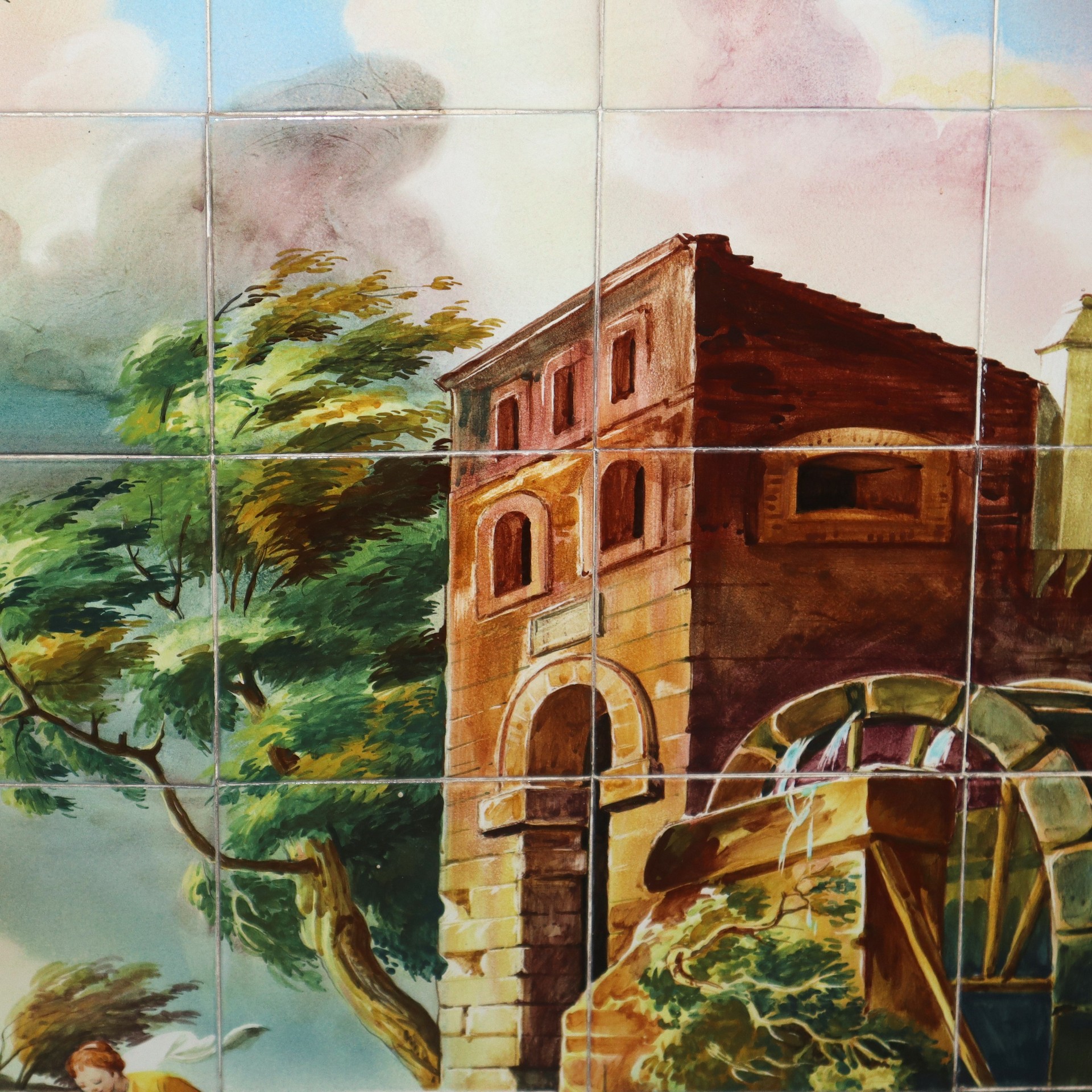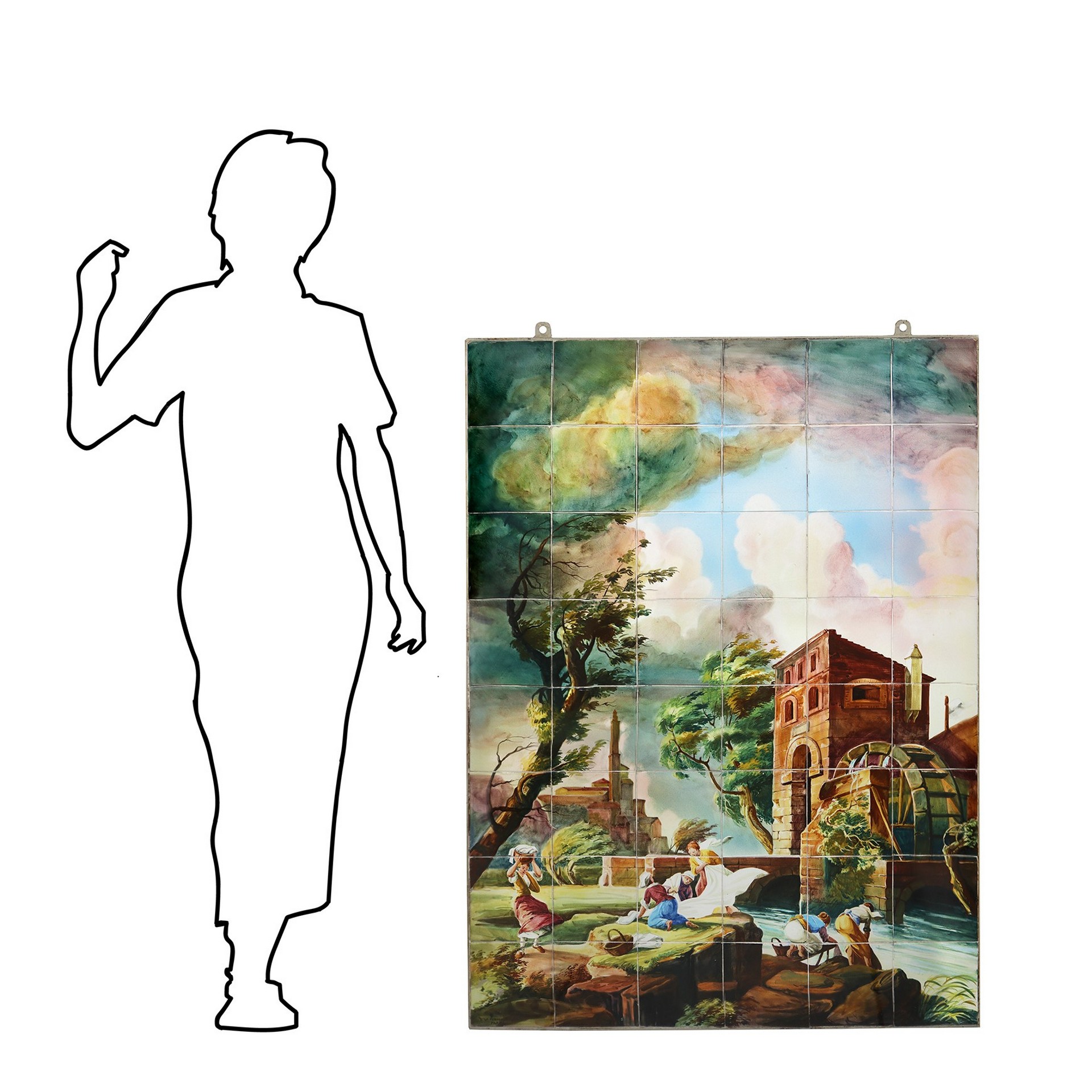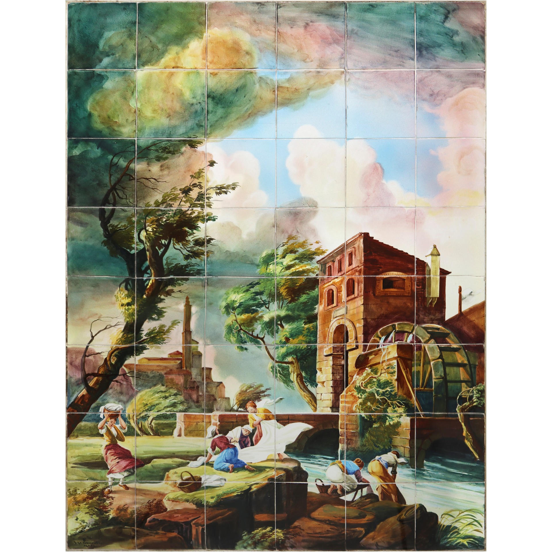 Farnesiana Ceramiche di Carlo Corvi - Maiolica raffigurante paesaggio fluviale con alberi e personaggi, 1950s H cm 122 x 92 Ceramica Composta da 48 formelle cm 15 x 14. In telaio di ferro di forma rettangolare. Firmato in basso a sinistra "Farnesiana Parma" di Carlo Corvi.