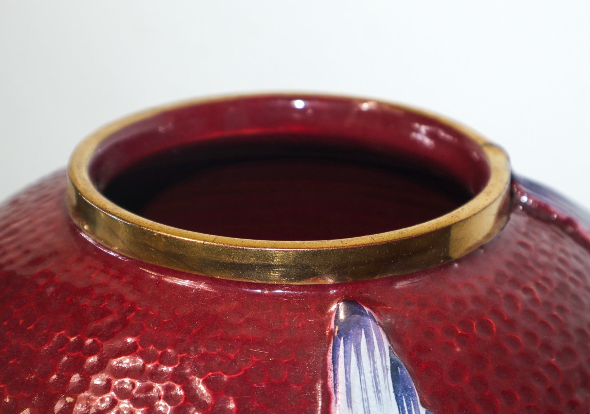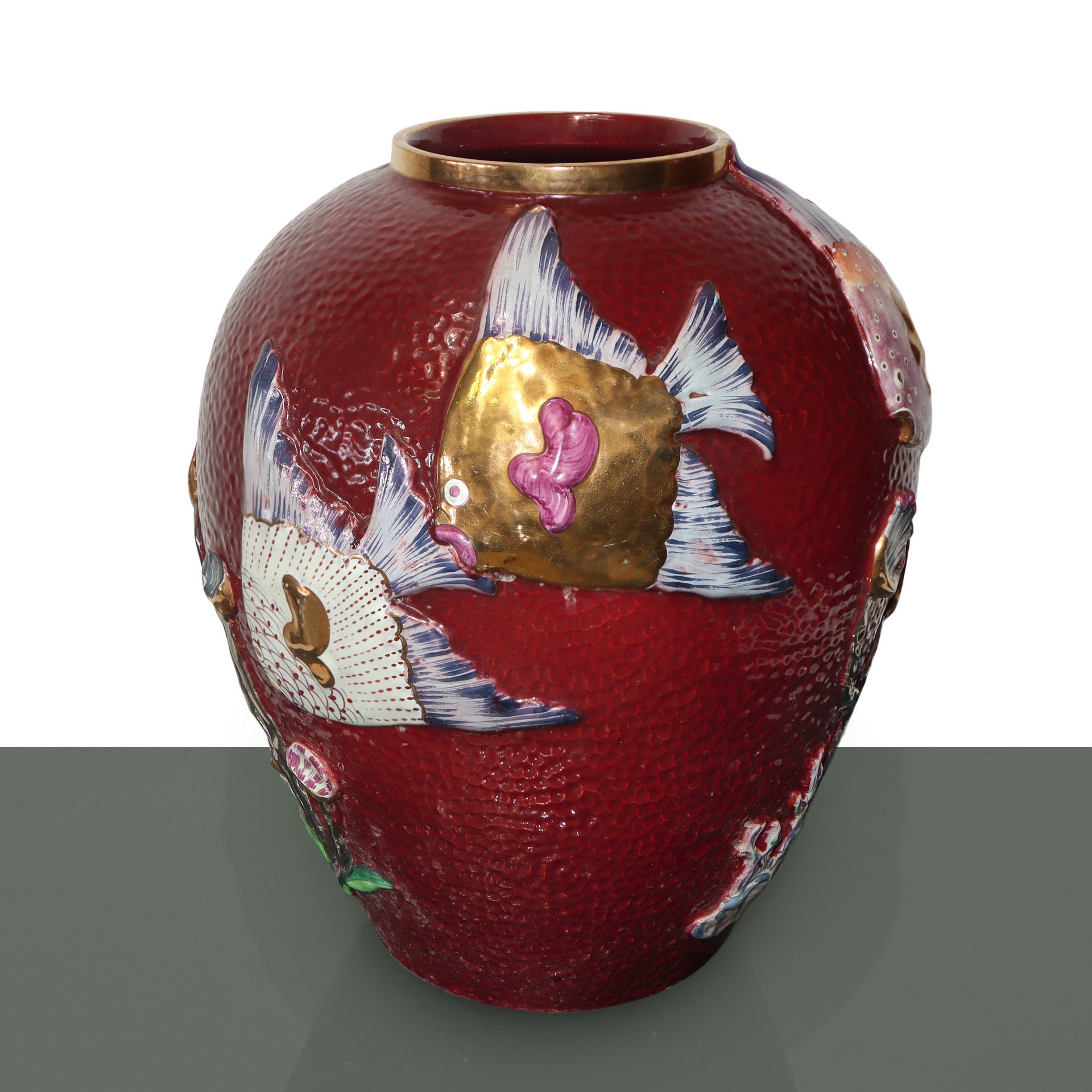 Vaso in ceramica bordeaux con pesci e alghe in rilievo h cm 38X32