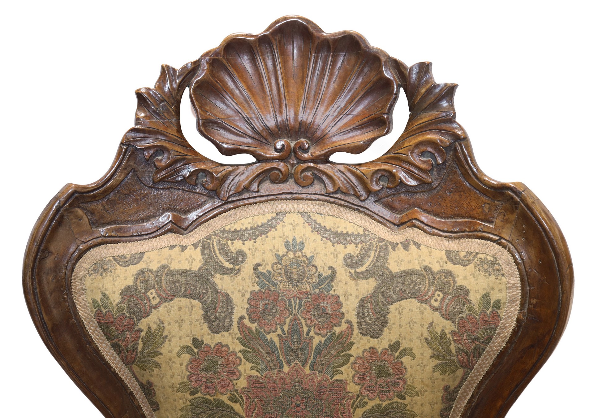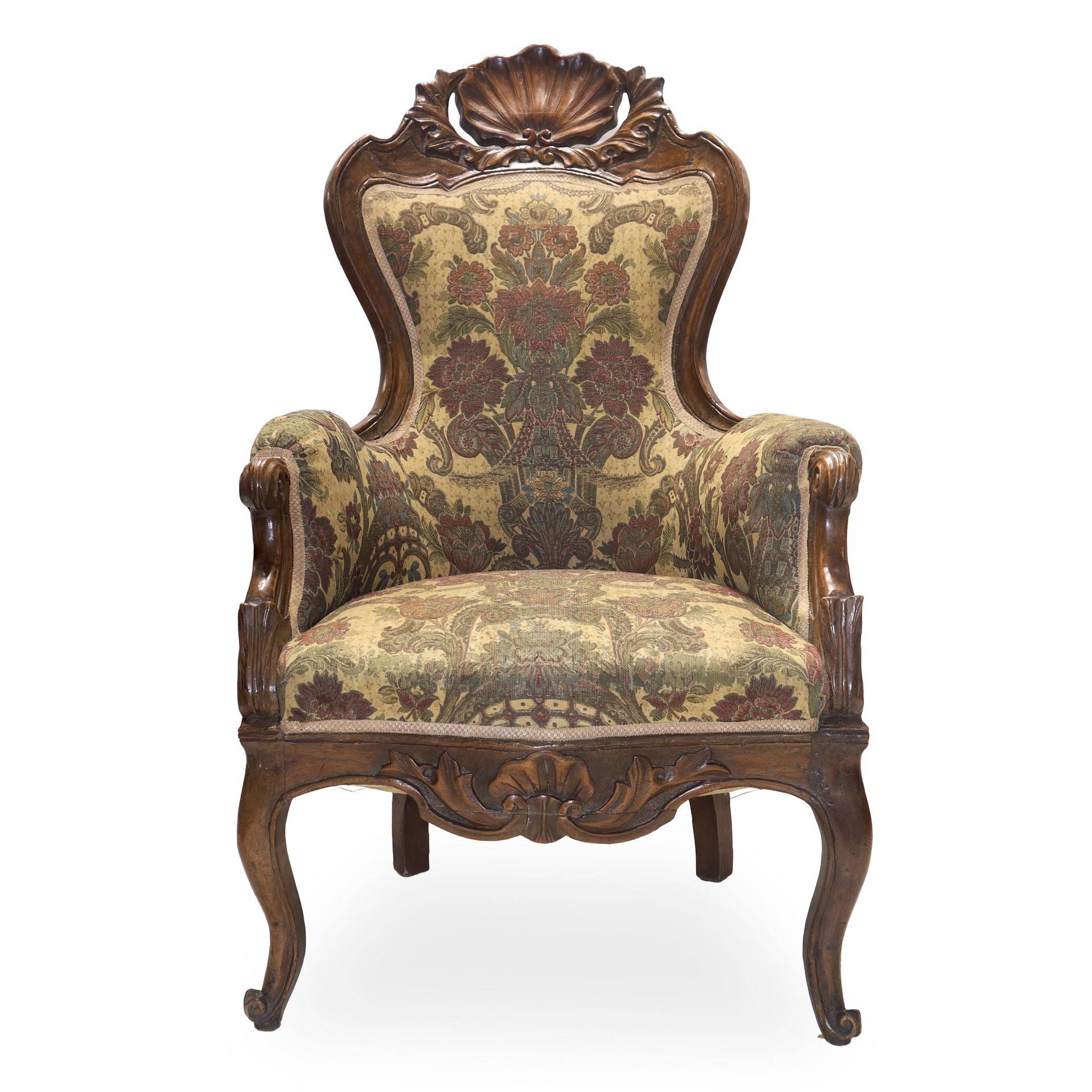 Poltrona Luigi Filippo imbottita con spalliera in legno intagliato, piedi a cabriole