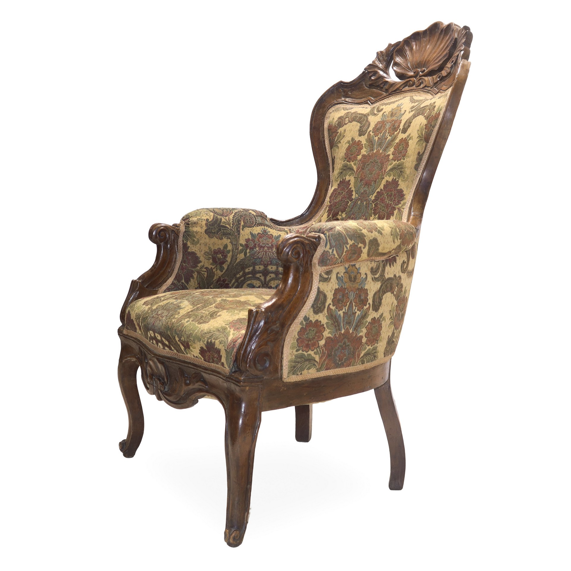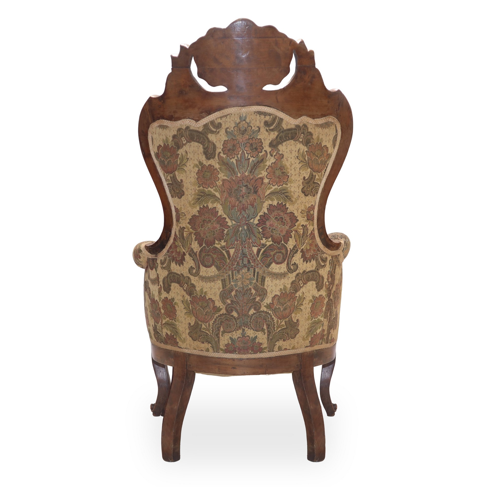Poltrona Luigi Filippo imbottita con spalliera in legno intagliato, piedi a cabriole h cm 109X56X65