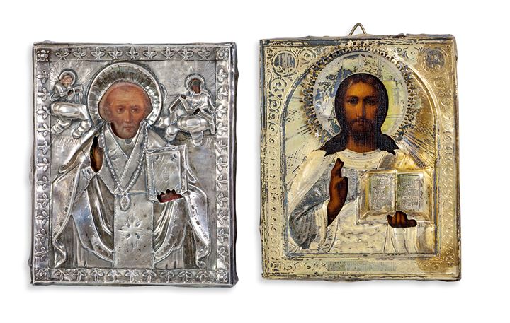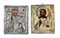 Russia, XIX secolo: la prima raffigurante San Nicola, con riza in argento 84 zolotnik, San Pietroburgo 1828, assaggiatore Nicolai Dubrowin, cm 13,7x11,5; la seconda raffigurante Cristo, riza in argento dorato 84 zolotnik, Mosca 1908-1917, cm 13,5x11