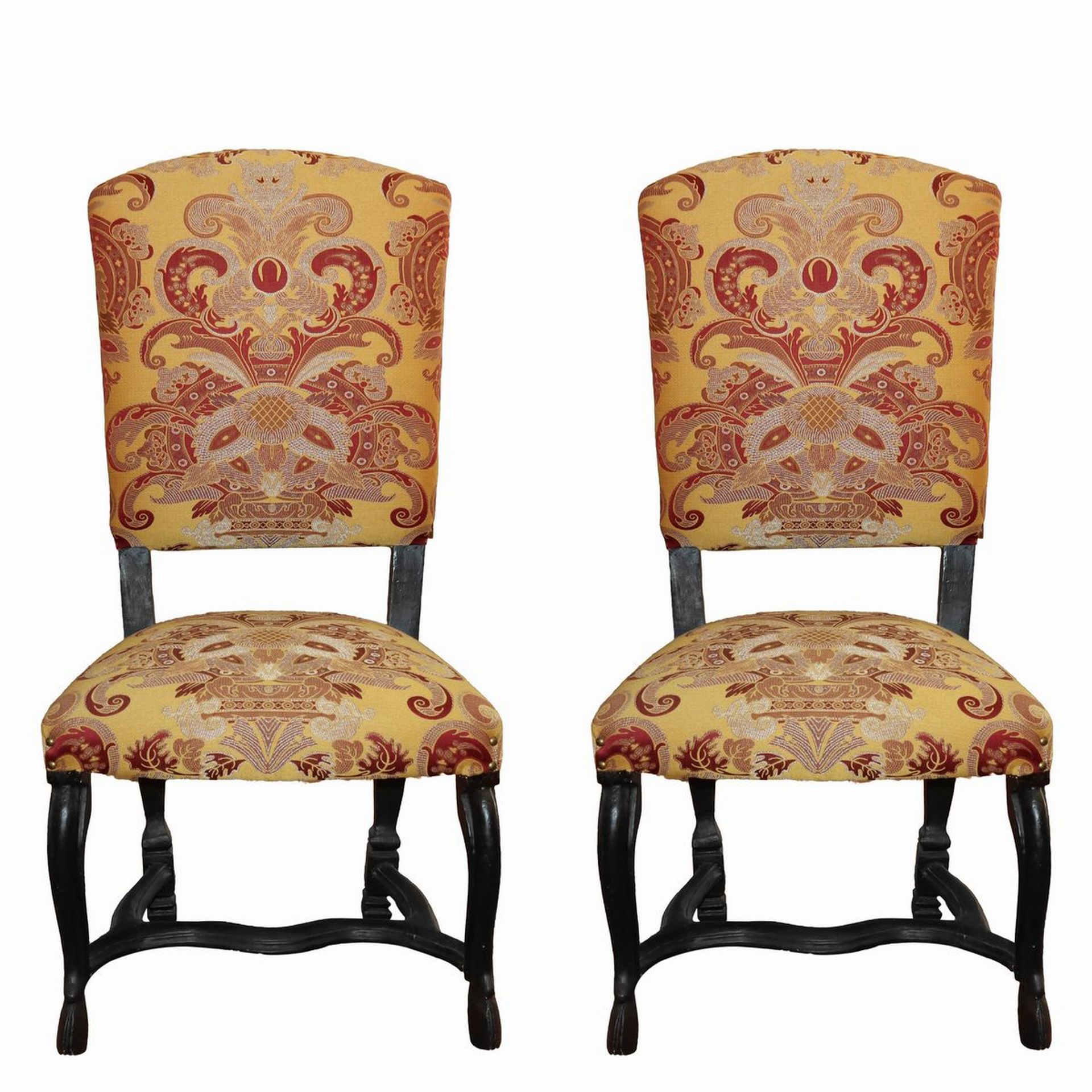 Lotto 246 | Coppia di sedie Luigi XIV, barocche, tapezzate in damasco nei toni del bordeaux e giallo., early 18° secolo