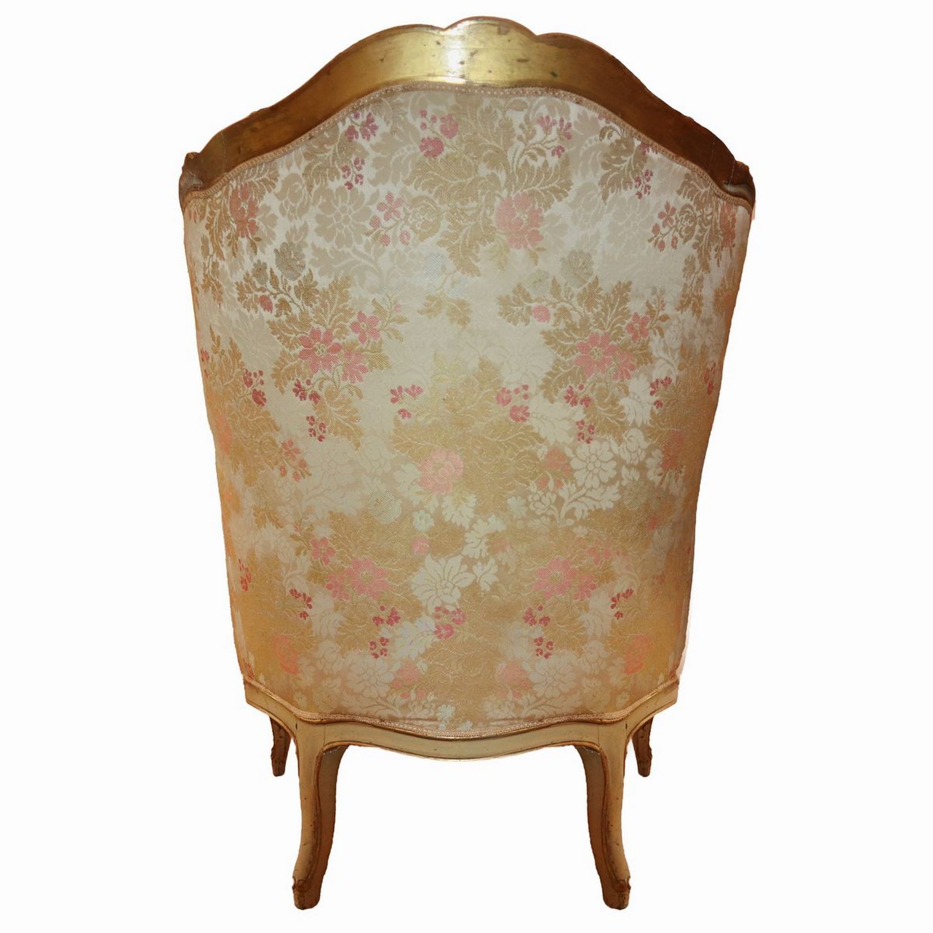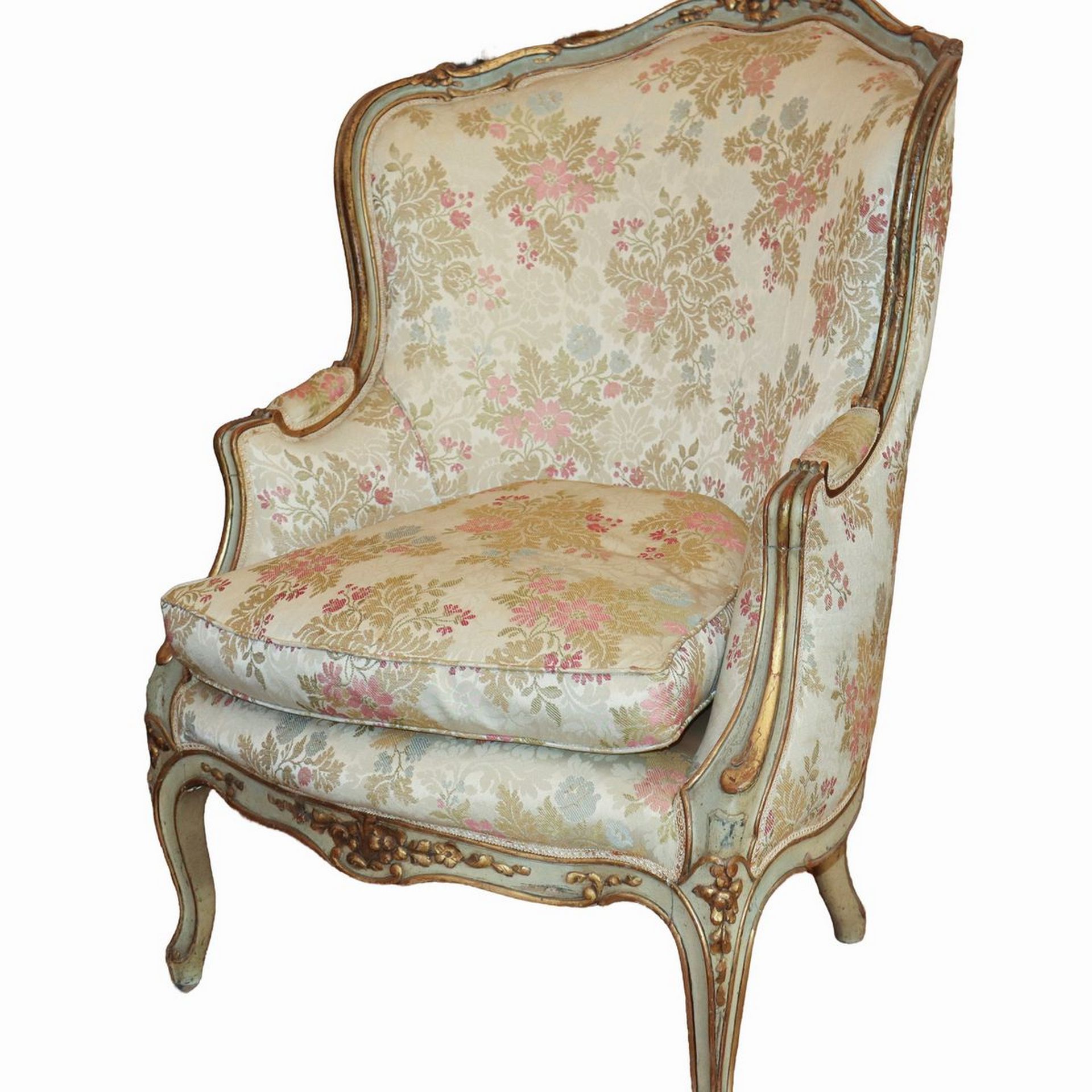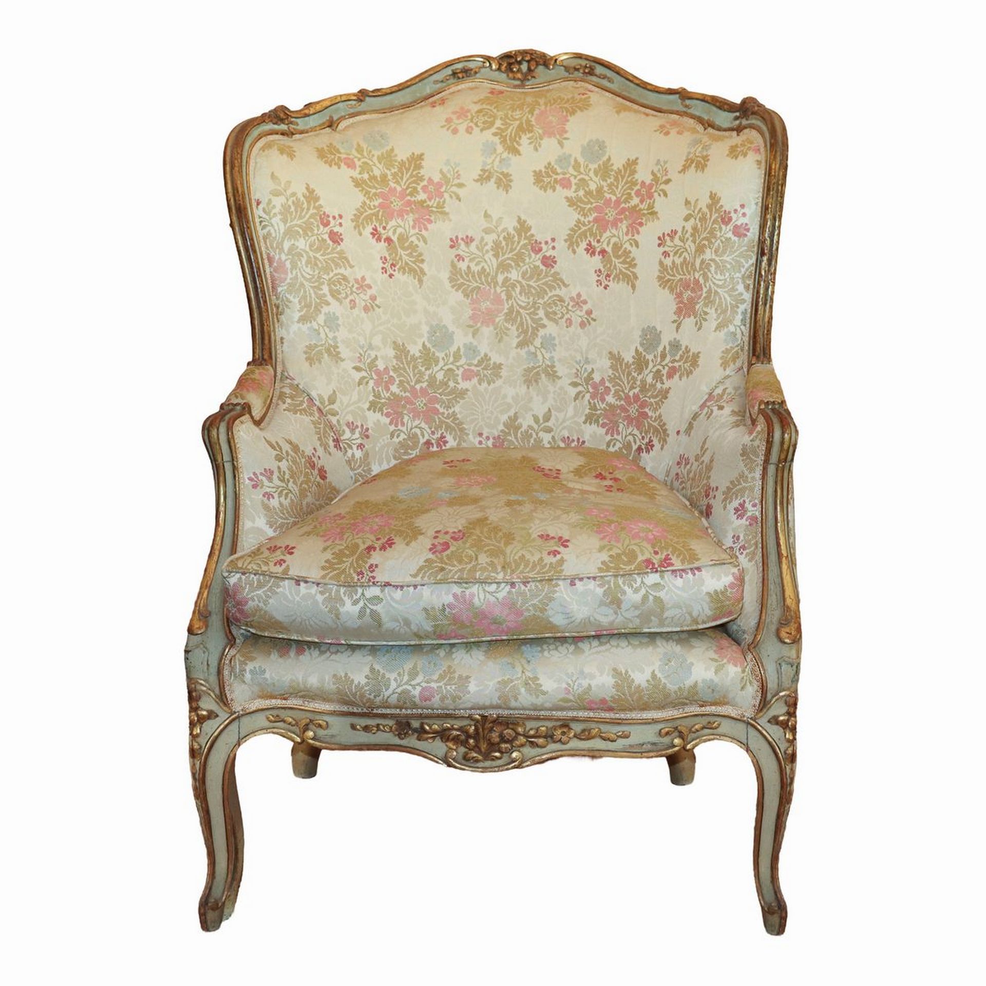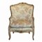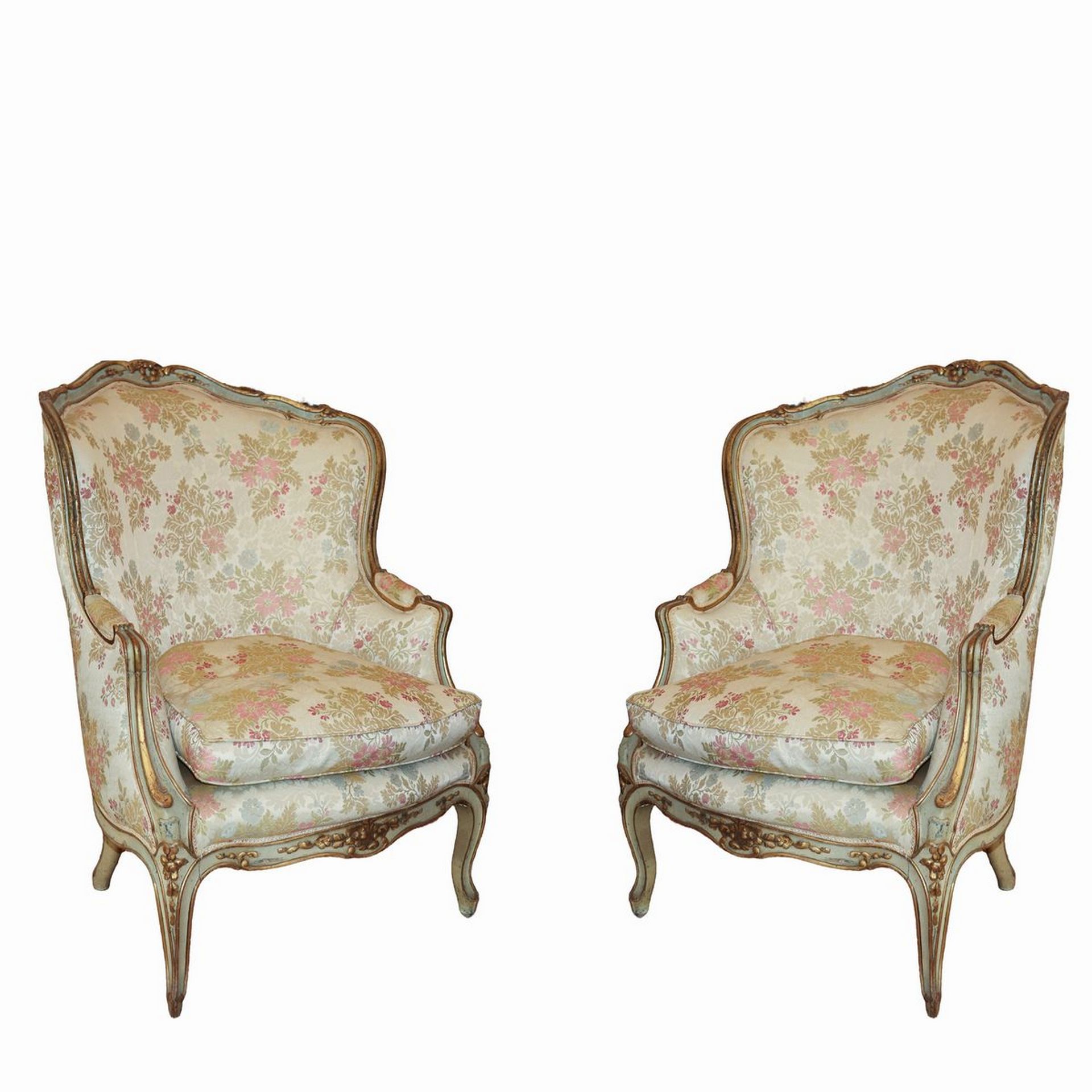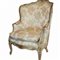 Antica coppia di bergeres, Luigi XV. In legno finemente intagliato e laccato. Tapezzeria a motivi floreali.