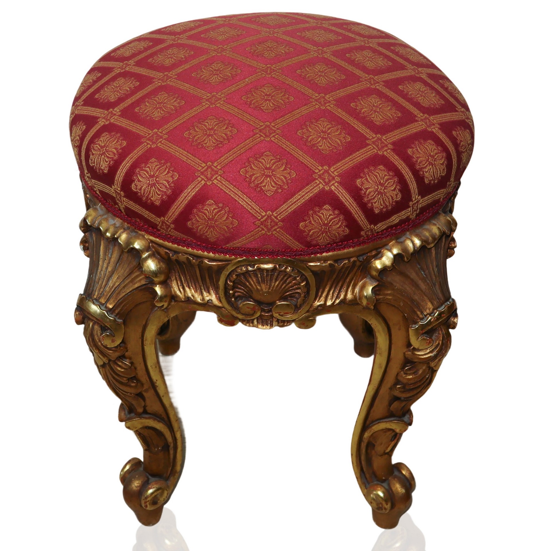 Coppia di sgabelli in legno dorato con tappezzeria rossa e dorata, early 20° secolo
