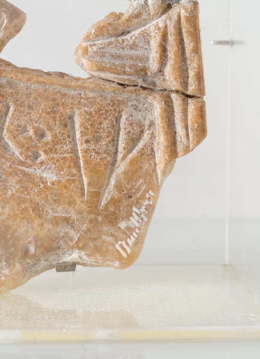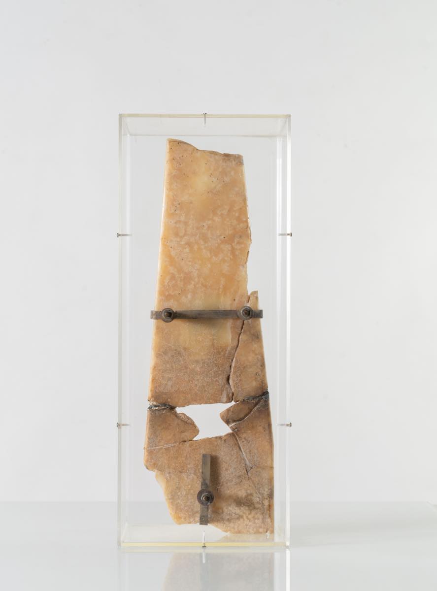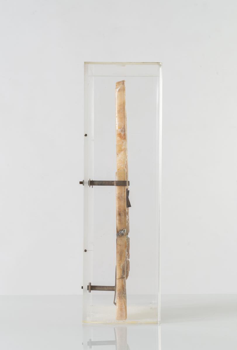 Alabastro con inserto di ottone, fimato in basso a destra, in teca plexiglas H cm 50x20x25