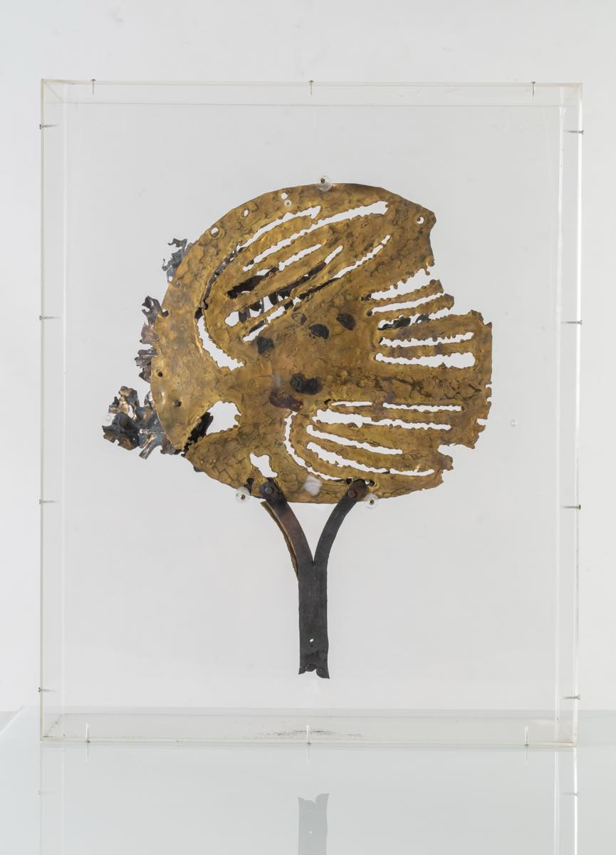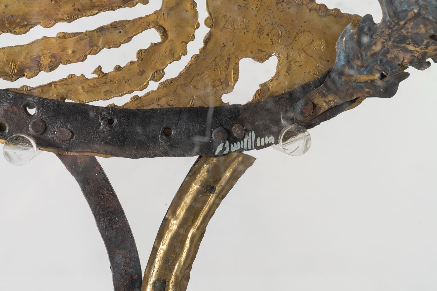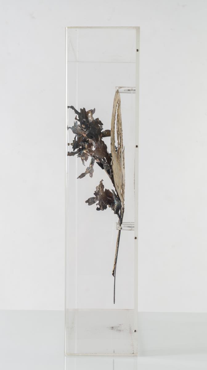 Bronzo con varie patine e inserto centrale di quarzo ialino, firmato in basso a destra, in teca plexiglas H cm 68x55x15,5