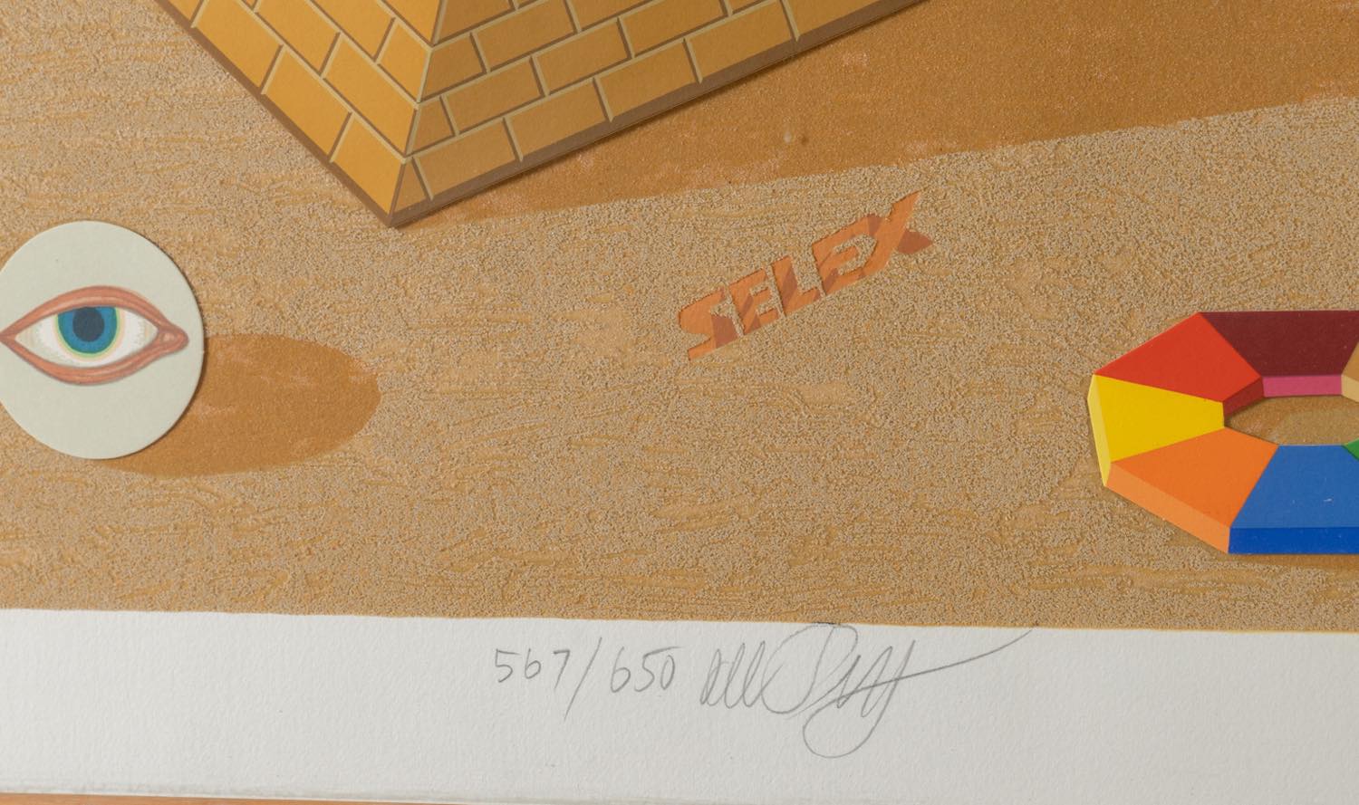 Serigrafia polimaterica e collage su carta, reca in basso al centro firma a matita e numero di tiratura 567/650, lastra H cm 69x50 - con cornice H cm 83,5x63