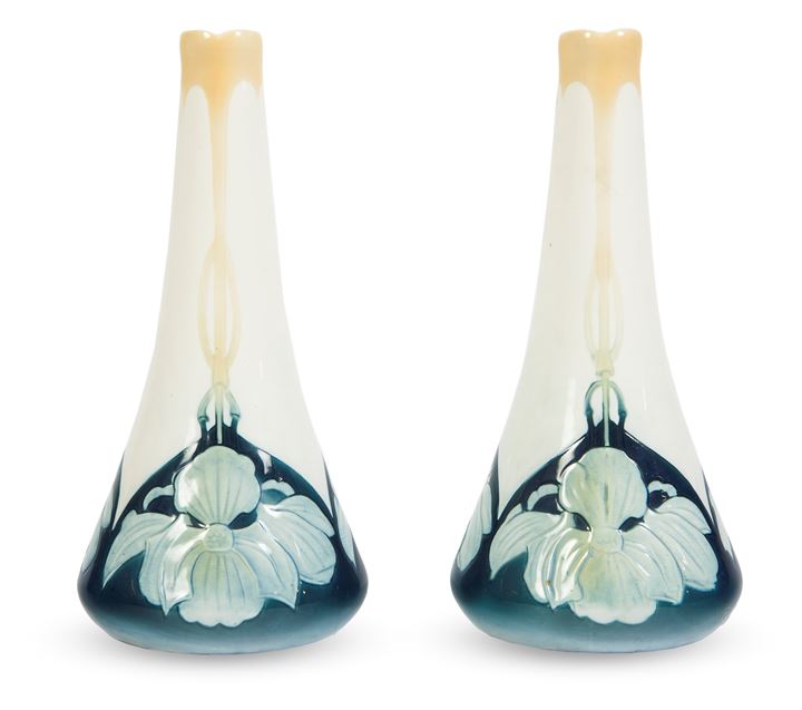 COPPIA DI VASI H cm 28,5 Siglata "R.P" In porcellana, a forma di ampolla,...