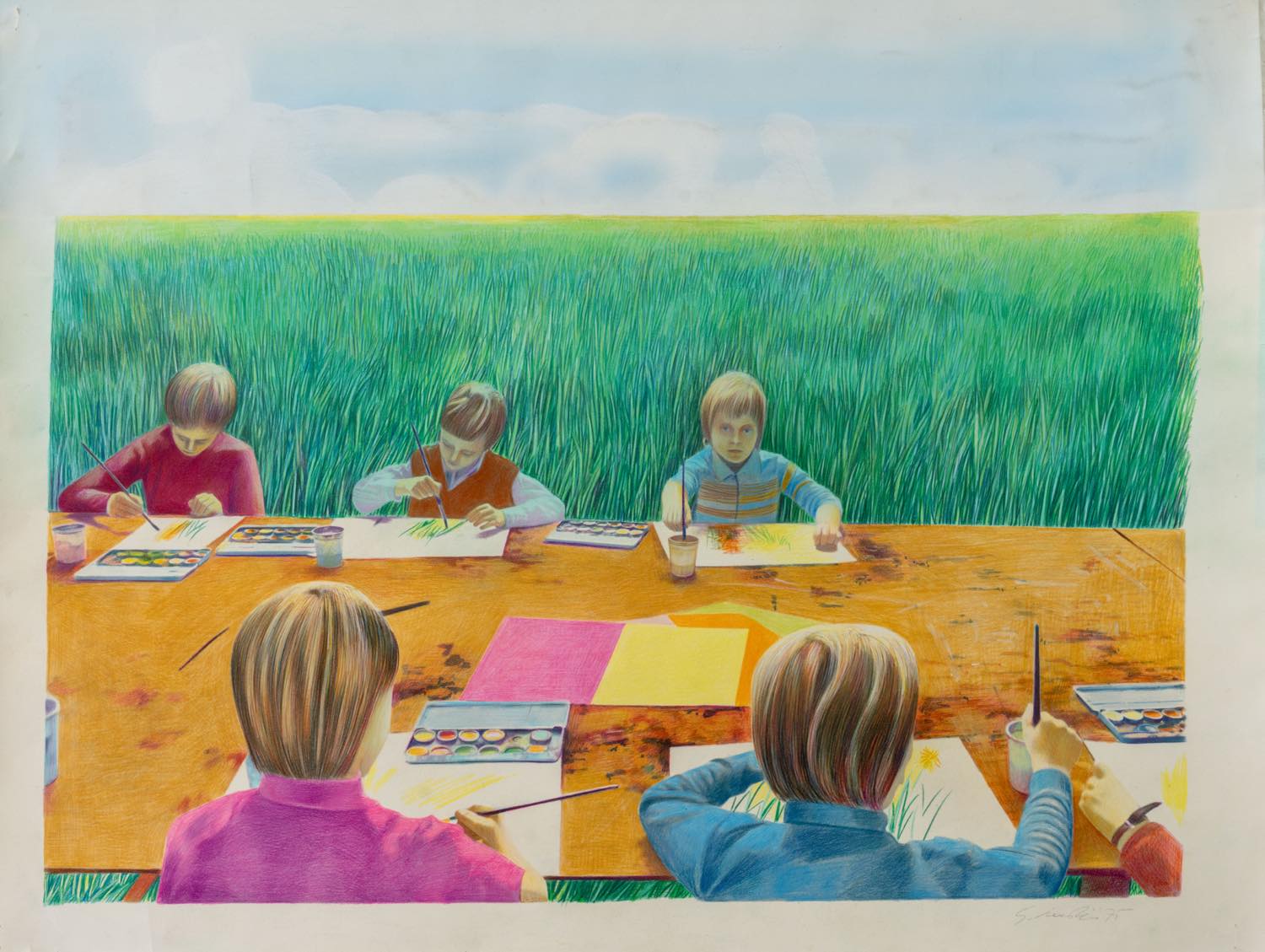 Giuseppe Landini (Bologna 1939), "Lezione di pittura", 1975.