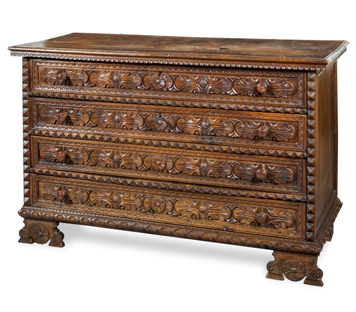 XVIII sec., in noce, a quatto tiretti, fronte scolpito, piedi a mensola scolpiti
