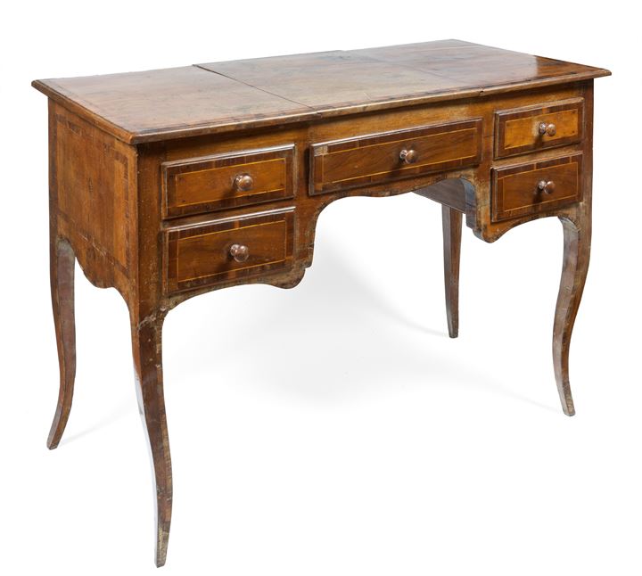 A giorno, da centro, Piemonte XVIII sec., in noce filettato, a tre tiretti, piano in tre pezzi apribile, che cela vani.