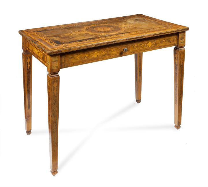 In noce, interamente intarsiato, ad un tiretto, gambe tronco-piramidali