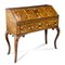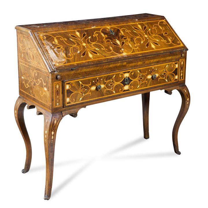 Piemonte, XVIII sec., lastronato in noce e radica di noce, intarsiato in acero, palissandro e avorio; un tiretto. La calatoia cela sette tirettini; gamba alta, mossa ed intarsiata