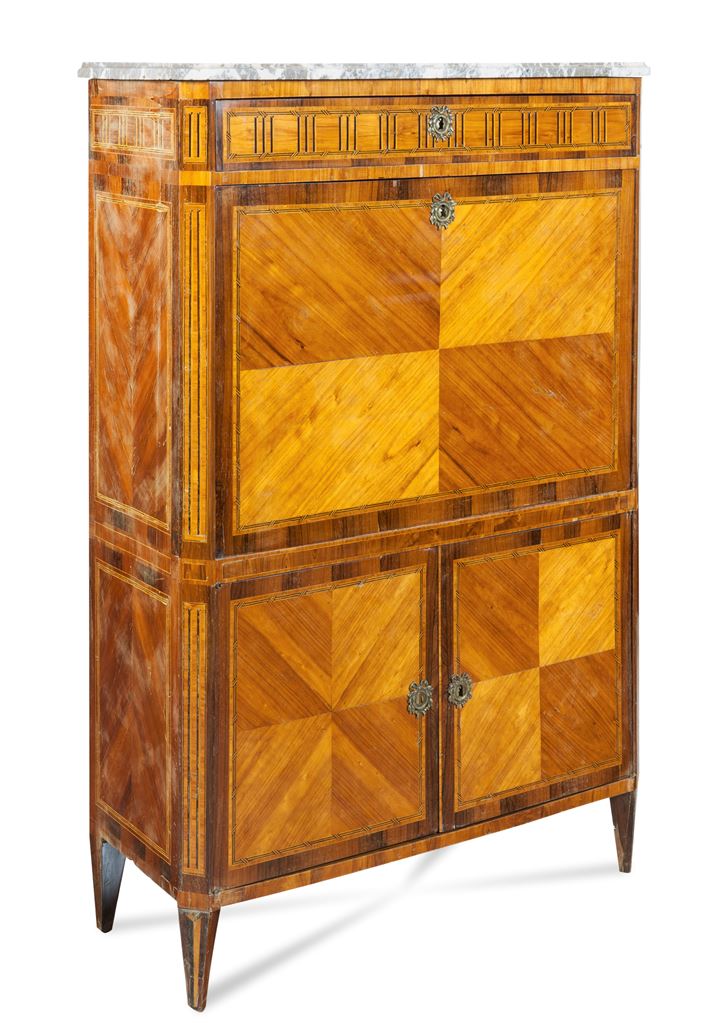 Francia, epoca Luigi XVI, fine XVIII/inizi XIX secolo, lastronato in mogano e palissandro, intarsiato, piano in marmo, un tiretto e due ante. La calatoia cela vani e sei tiretti. Gambe a forma troncopiramidale