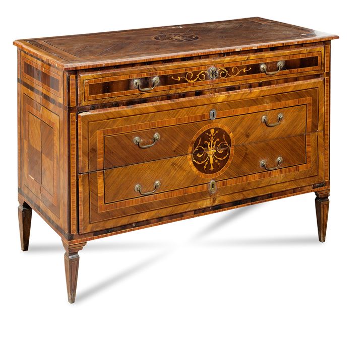 Epoca Luigi XVI, fine XVIII sec., lastronato in noce ed intarsiato, a tre tiretti, gambe tronco-piramidali