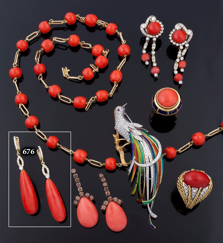 In oro giallo con due gocce di corallo mediterraneo sormontate da piccoli diamanti taglio brillante per complessivi ct 0,45 ca