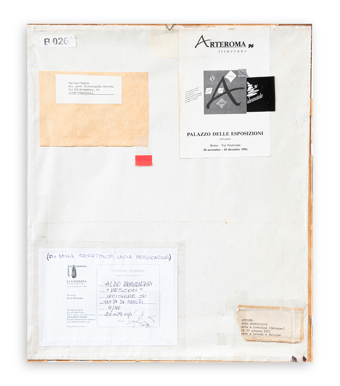 Certificato di garanzia a cura della Galleria La Lanterna (TO) al retro del cartoncino protettivo