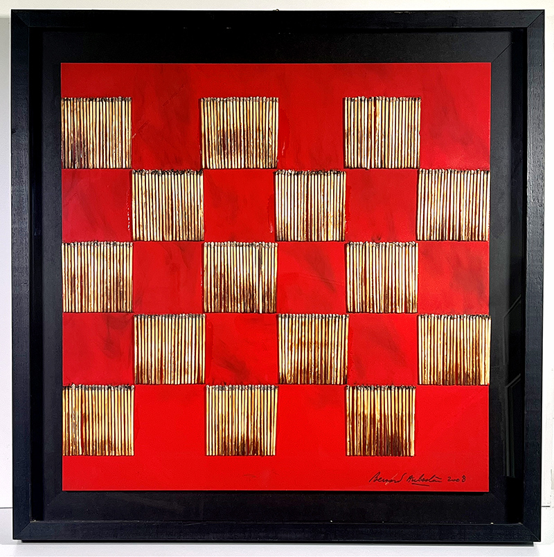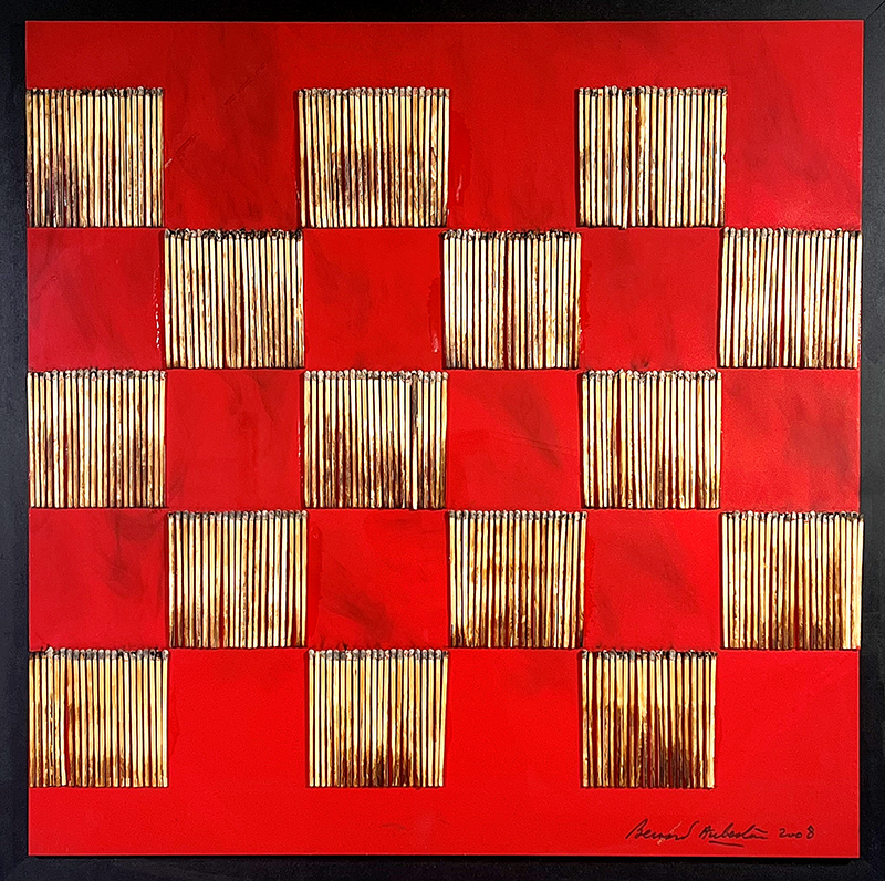 BERNARD AUBERTIN, 2008, Acrilico e fiammiferi bruciati su tavola, dim. 60x60 cm. Firma e anno in basso a destra. Opera registrata presso Archivio Generale opere Bernard Aubertin al numero DFT - 22500000802015 - RSN. Certificato di autenticità e archiviazione su fotografia. Bibliografia: Opera pubblicata sul catalogo "Bernard Aubertin œuvres récentes", 2012 testo di Dominuque Stella a pag. 100. Esposizioni: "Bernard Aubertin - Il fuoco e il rosso" tenutasi presso la Galleria Rosenberg di Milano nel 2010. Provenienza Galleria Rosenberg Milano