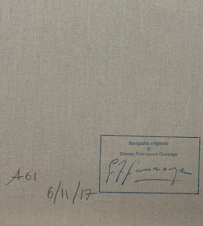 Precedente Lotto 13 Successivo Daliano Ribani Aste - Via Don Minzoni 23, 54033 Carrara ASTA N. 40 DI ARTE MODERNA E CONTEMPORANEA SESSIONE UNICA venerdì 12 settembre 2025 ore 16:30 (UTC +01:00) GIOVANFRANCESCO GONZAGA GIOVANFRANCESCO GONZAGA, serigrafia su tela, 50x70 cm