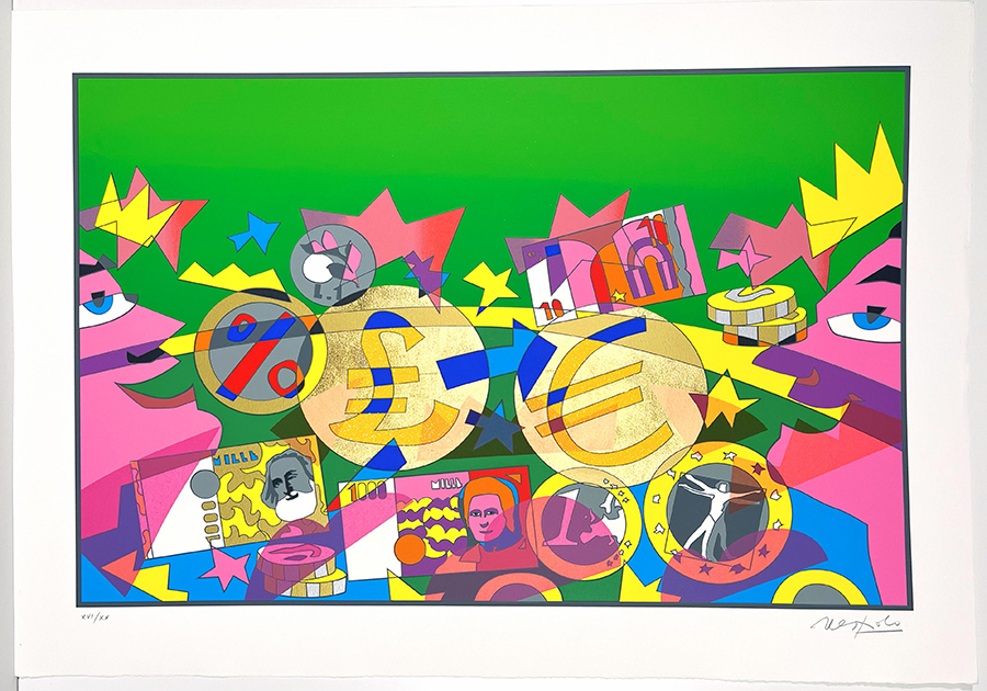 UGO NESPOLO, "Oro Euro", Serigrafia su cartoncino, 70x100 cm, Firma in basso a destra e numerazione in basso a sinistra