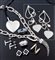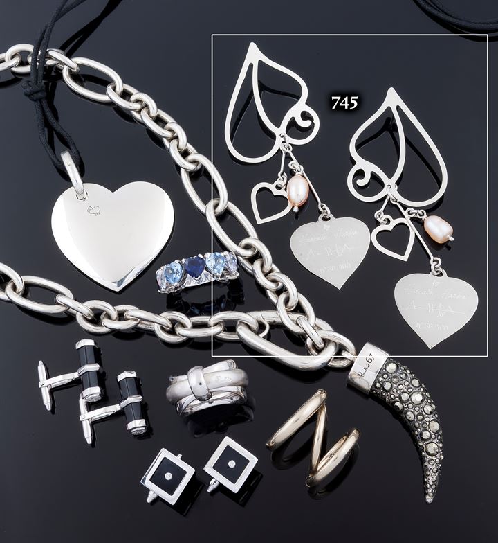 Coppia di orecchini pendenti in argento 925/1000; struttura a lobo a volute, da cui dipartono cuori e perline pendenti. Esemplare 30/100 firmati.