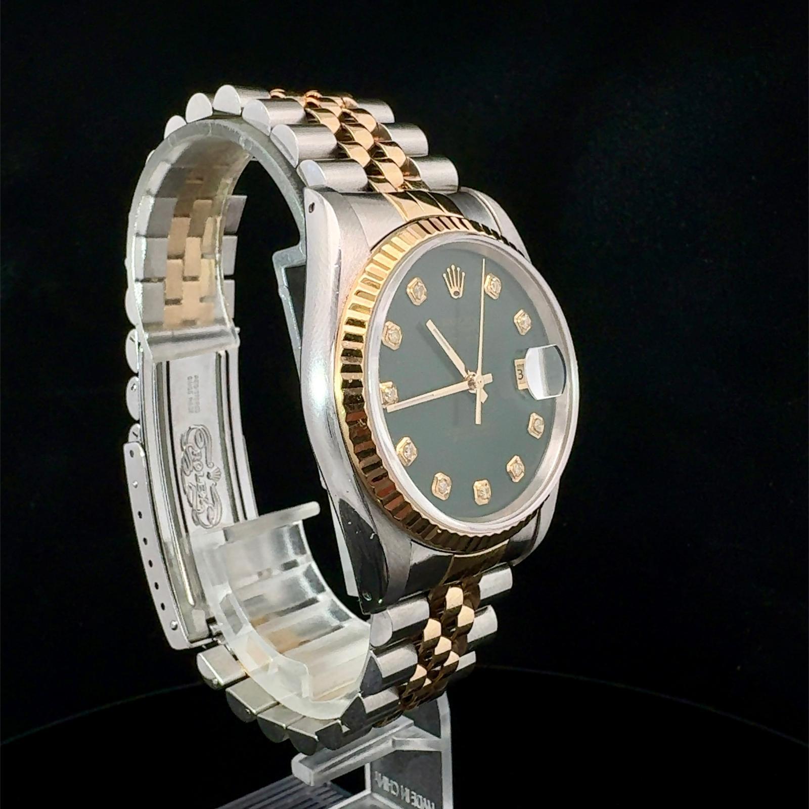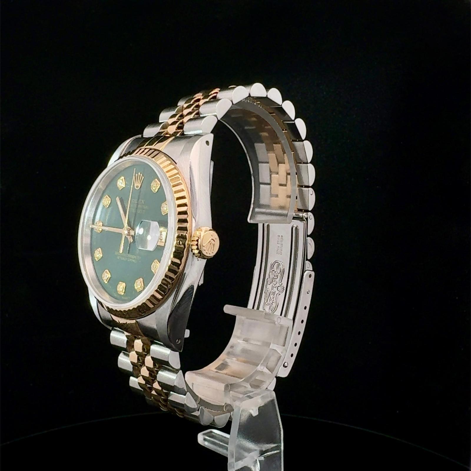 Marca Rolex Modello (Orologio) Datejust 36 Numero di referenza 16233 Carica Automatico Materiale della cassa Oro/Acciaio Materiale cinturino Oro/acciaio Anno di produzione 1991 documenti originali, no box Cassa Materiale della cassa Oro/Acciaio Diametro 36 mm Impermeabile 10 ATM Materiale lunetta Oro giallo Vetro Vetro zaffiro Numeri sul quadrante Senza numeri Cinturino Materiale cinturino Oro/acciaio Colore cinturino Oro/acciaio Chiusura Déployante Materiale chiusura Acciaio Quadrante verde diamanti aftermarket - COMMISSIONE D’ASTA 25%