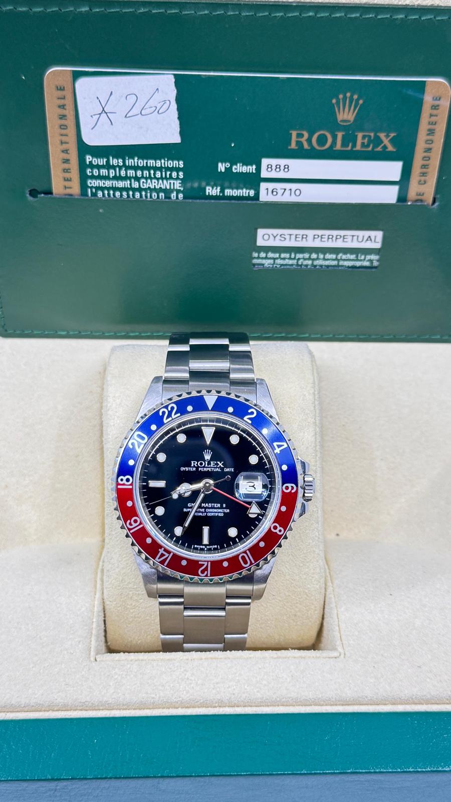 Rolex Modello (Orologio) GMT-Master II Numero di referenza 16710 Cassa no fori Carica Automatico Materiale della cassa Acciaio Materiale cinturino Acciaio Condizione Usato L'articolo presenta segni di usura lievi, come ad esempio graffi leggeri, ma non percepibili al tatto. documenti originali Rolex, no box la scatola utilizzata solo per fotografie non in vendita Carica Automatico anno 2007 Materiale della cassa Acciaio Diametro 40 mm Impermeabile 10 ATM Materiale lunetta Acciaio Vetro Vetro zaffiro Quadrante Nero Numeri sul quadrante Senza numeri Cinturino Materiale cinturino Acciaio Colore cinturino Acciaio Chiusura Déployante Materiale chiusura Acciaio Funzioni Data, GMT - COMMISSIONE D’ASTA 25%