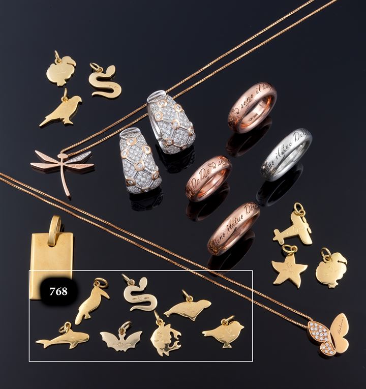 Lotto di sette ciondoli firmati "Pomellato", modello "Dodo", raffiguranti: un tucano, un pettirosso, uno squalo, un pipistrello, un serpente, una foca e un granchio