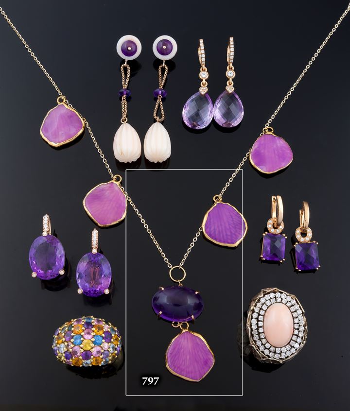 In oro giallo e bianco recante cinque petali pendenti di orchidea invetriati e al centro ametista cabochon