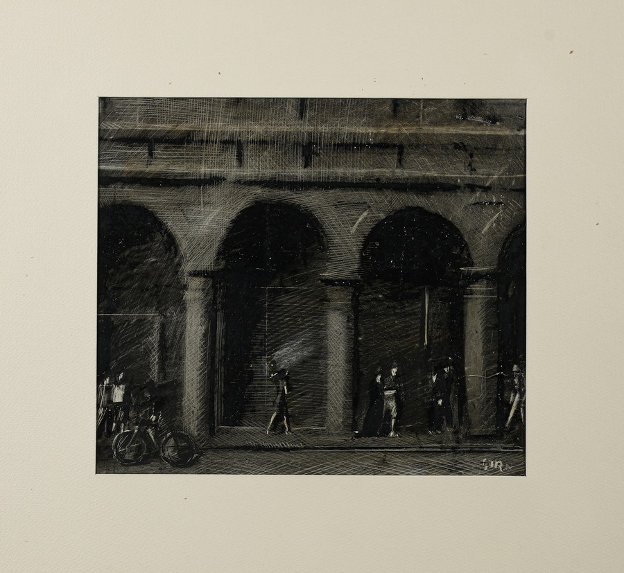 SIRONI MARIO (1885 - 1961) TAVOLA ORIGINALE DELL'ILLUSTRAZIONE DELLA NOVELLA IL VIAGGIO DI ENZO GRAZZINI. 1930. Tempera, cera graffiata e matita grassa su cartoncino. Cm 30,00 x 26,50. firma