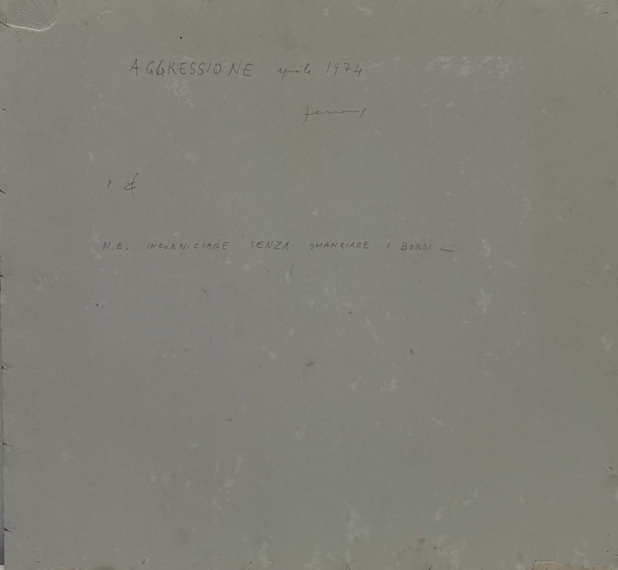FERRONI GIANFRANCO (1927 - 2001) AGGRESSIONE . 1974. Matita su cartoncino. Cm 35,00 x 33,00. firma, data e dedica ad personam