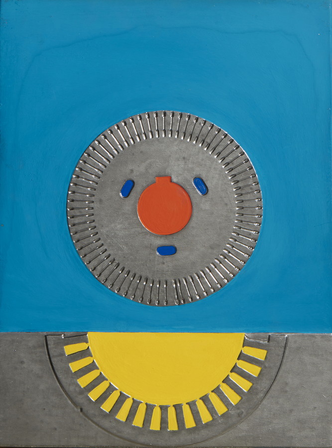 CRIPPA ROBERTO GAETANO (1921 - 1972) SOLE GIALLO . 1961. collage polimaterico su tavola. Cm 32,00 x 42,00. sul retro: data e iscrizione a cura di Rosangela Baggini, datata 1972.