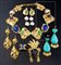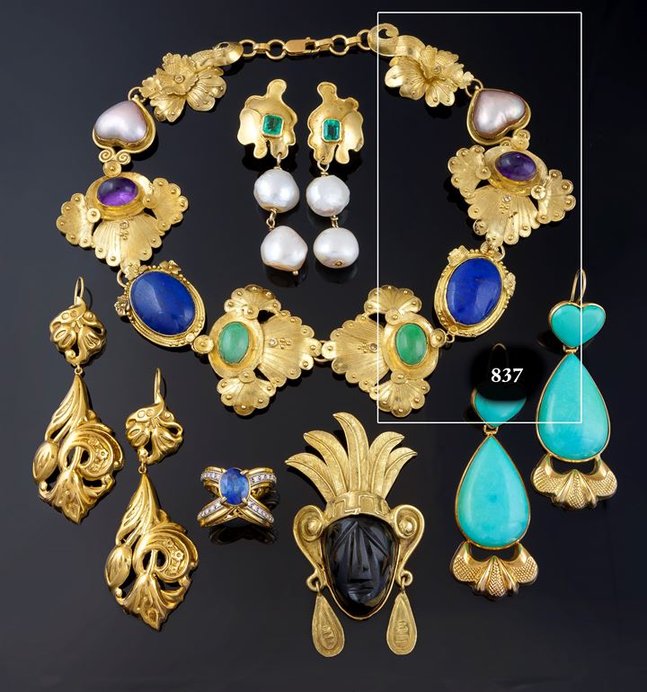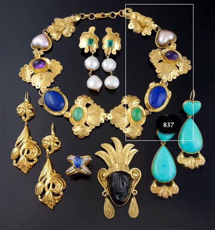 In oro giallo composto da foglie stilizzate e turchesi taglio ovale, perle a forma di cuore, ametiste cabochon e lapislazzuli ovali