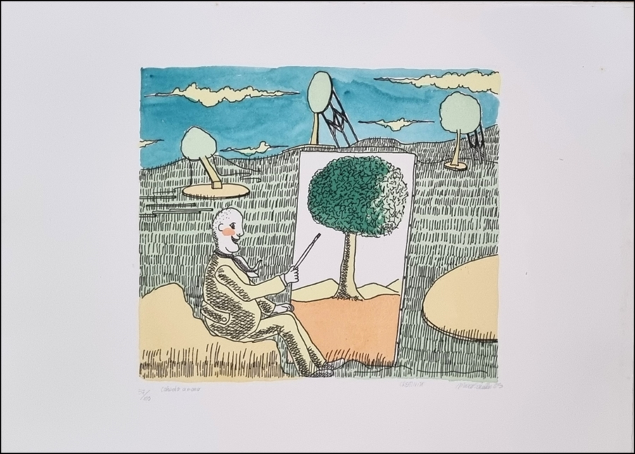 SCHULER MARCO Germania 1972 "Creatività" Incisione su cartoncino colorata a mano cm 70x50. Intitolata e firmata sul fronte in basso a destra, tiratura 57/100 e dicitura "colorata a mano" a sinistra.