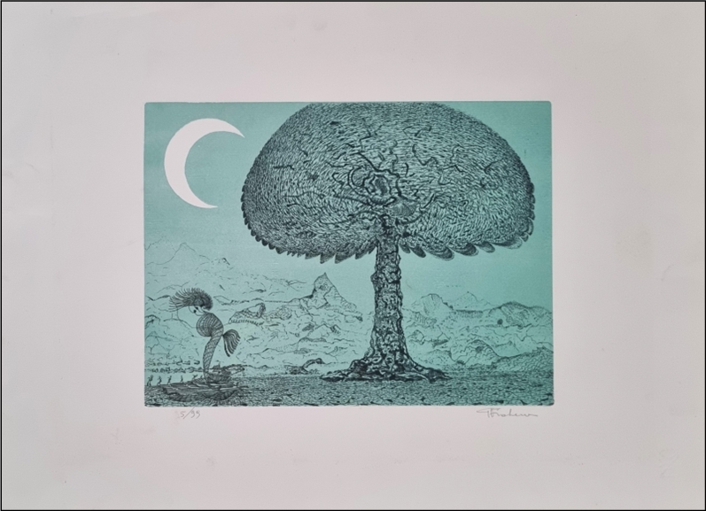 FICHERA GIANNI Catania 1925 "Albero degli elfi" Acquaforte su cartoncino cm 69x50, disegno cm 39,5x29,5. Firmata sul fronte in basso a destra, tiratura 25/99 a sinistra. Certificato di garanzia a cura di Edizioni d'Arte Angolare.