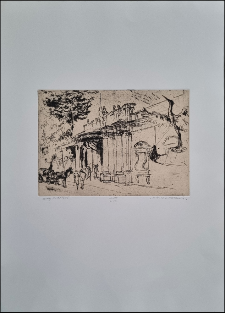 PIACESI WALTER Ascoli Piceno 1929 - Fermignano 2022 "Le darsene di Montecatini" Incisione acquaforte su cartoncino cm 50x70 (foglio), cm 33,5x24 (disegno), del 1980. Intitolata sul fronte in basso a destra, tiratura 2/5 al centro, firma e data a sinistra.