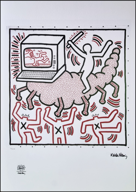 HARING KEITH Pennsylvania 1958 - New York 1990 "Senza titolo" Riproduzione litografica offset cm 50x70. Firma in stampa sul fronte in basso a destra, tiratura 57/150, timbro a secco e timbro in stampa a sinistra.