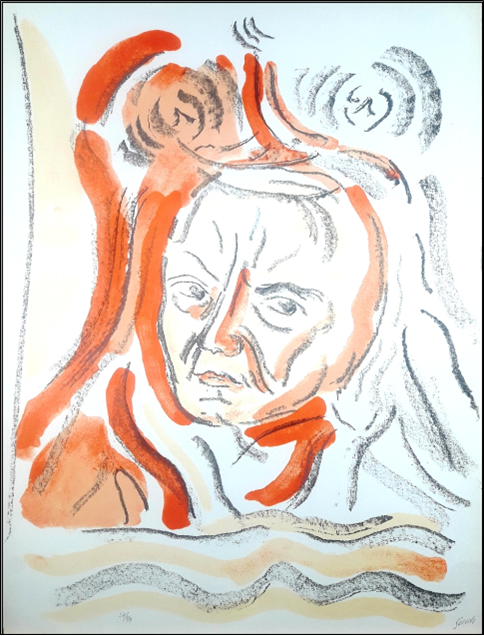 GUIDI VIRGILIO Roma 1891 - Venezia 1984 "Autoritratto" Litografia su cartoncino cm 48x64 del 1977. Timbro a secco e firma a matita sul fronte in basso a destra, tiratura 57/99 a sinistra.