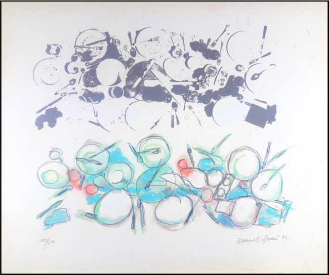 SPOERRI DANIEL Romania 1930 - Vienna 2024 "Senza titolo" Serigrafia su cartoncino cm 50x60 del 1992. Firmata e datata a matita sul fronte in basso a destra, tiratura 113/250 a sinistra.