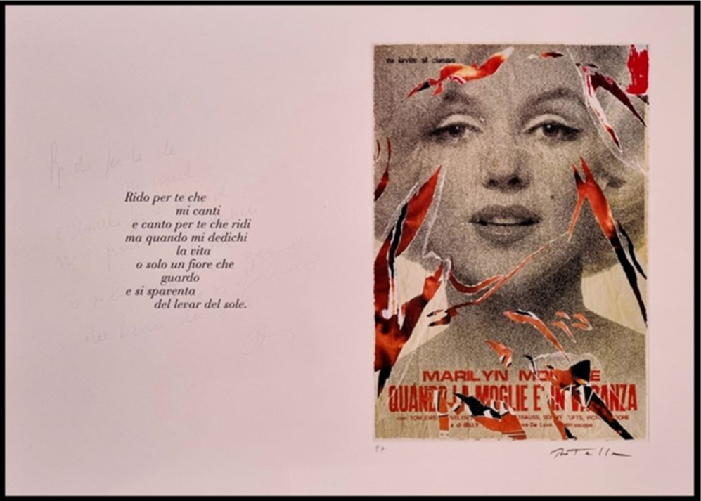 ROTELLA MIMMO Catanzaro 1918 - Milano 2006 "Atto d'amore" Serigrafia su cartoncino cm 70x50. Firmata sul fronte in basso a destra, tiratura P.A. a sinistra, con poesia. Certificato di autenticità a cura della Spirale Arte Milano.