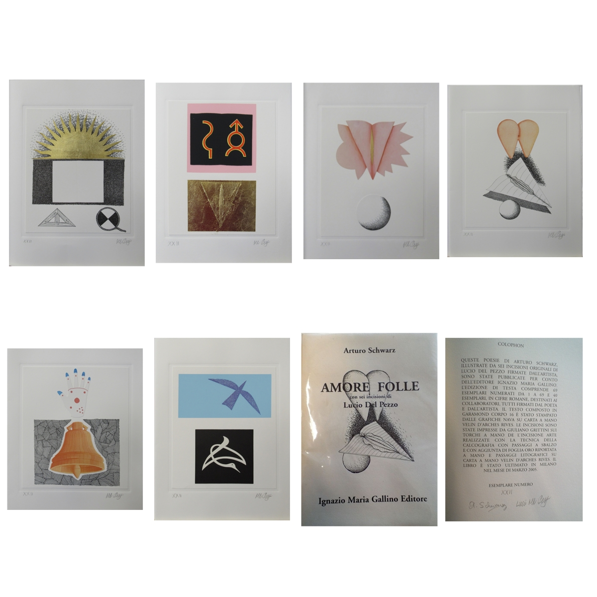 DEL PEZZO LUCIO Napoli 1933 - Milano 2020 "Libro d'autore - Amore folle" Libro contenente poesie di Arturo Schwarz, illustrate da sei incisioni originali del Maestro, cm 28x38, tutte firmate. Esemplare XXII.