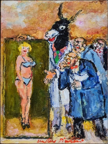 PIACESI WALTER Ascoli Piceno 1929 - Fermignano 2022 "Genio e supervisori" Olio su tavola cm 18x24 del 2012. Firmato sul fronte in basso al centro. Al verso firma, titolo, tecnica e numero d'archivio. Autentica firmata dal Maestro con numero d'archivio a cura di Studio d'Arte Ca' Spinello.