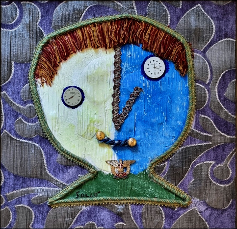 FALCO' PASQUALE Foggia 1952 "Personaggio" Tecnica mista, tappezzeria, passamanerie e applicazione di oggetti su tavola cm 30x30. Firmato sul fronte in basso a sinistra. Autentica su foto a cura del Maestro.