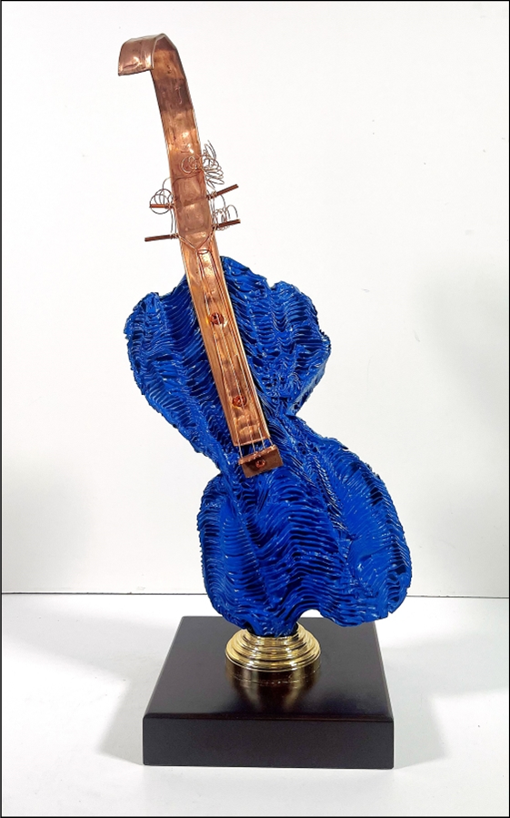 M'HORO' Italia XX sec. "Violino" Multiplo, scultura in resina epossidica placcata in blu con innesto di manico in rame, corde e ponticello, cm 16x43x15. Firmata e numerata sul manico. Opera registrata presso l'archivio M'horò, come da certificato di autenticità.