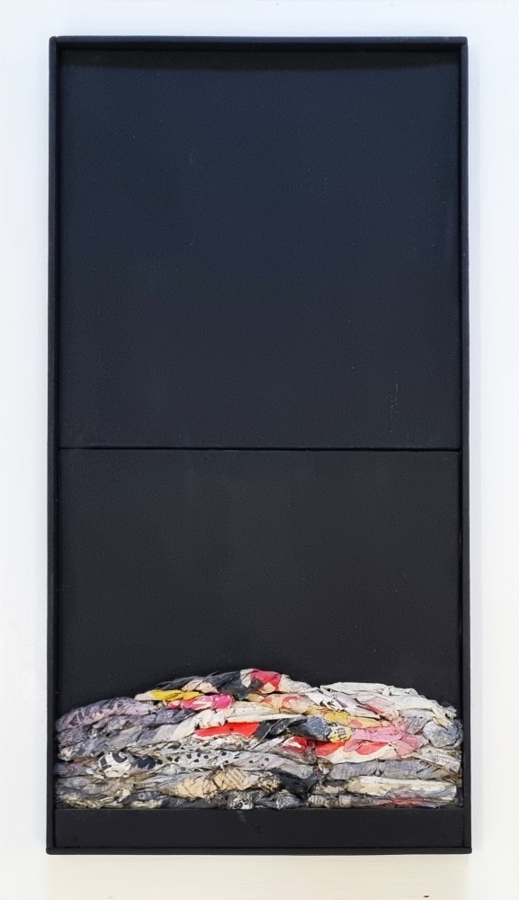 LETO GIOVANNI Monreale 1946 "Sezione di pozzo" Dittico, tecnica mista e applicazioni di carta su tela cm 30x30 (totale cm 30x60). Firmata, datata ed intitolata al verso sulla tela inferiore, firma e tagliandino Arte Fiera '90 sulla tela superiore.